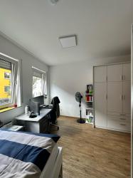 Das Zimmer ist voll möbliert mit einem Kleiderschrank, einem Wandregal, vier Regalelementen mit Fächern, einem Schreibtisch und einem Bett (die Matratze müsstest du allerdings selbst mitbringen). Außerdem gibt’s Laminatboden in Holzoptik und Fußbodenheizung, was das Zimmer besonders gemütlich macht.