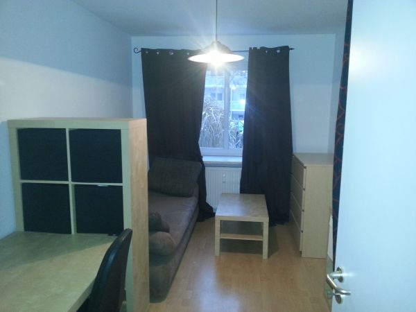 Das Zimmer befindet sich, wenn man zur Wohnungstür reinkommt auf der linken Seite und ist ca. 15m² groß. Es besitzt ein großes Fenster, welches tagsüber viel Licht zum Arbeiten verschafft. Ich übergebe es gern möbliert, kann es aber auch leer räumen. Einfach zu reinigender Laminatboden und weiße Wände, lassen das Zimmer sehr hygienisch wirken. Gern kann aber bei Mindestmietzeit von 1 Jahr auch gestrichen werden, wenn dir Farben lieber sind.