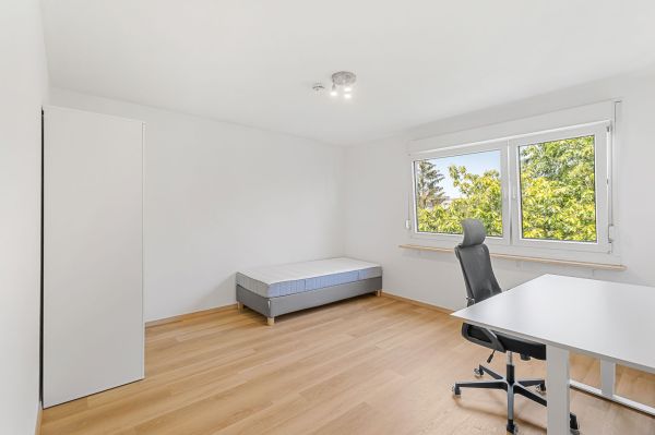 The rooms are fully furnished and each equipped with a comfortable box spring bed, a wardrobe with mirror, a height-adjustable desk, and an ergonomic desk chair. All rooms have external blinds and the entire apartment has underfloor heating. The building also has an elevator. You will also find a fast DSL connection (included in the rent).