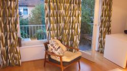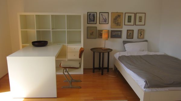freundlich und hell, möbliert mit Bett (1,40 m breit), großer Schrank, Regal,Teppich,Tischchen, Sessel und Schreibtisch mit Gartenblick. Schnelles Internet.