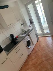 In der gemeinsamen Küche befindet sich eine neue Küchenzeile mit 4er Kochfeld, Ofen, Kühlschrank, Waschmaschine und ein Esstisch mit Stühlen. Aus der Küche gelangen beide Bewohner zuerst zu der verglasten Winterloggia und dann nach außen auf den neuen, geräumigen Westbalkon.